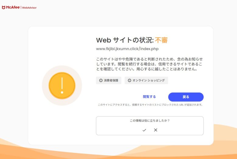 今度は、マカフィーさんがしっかり警告してくれました。ここも危ないサイトです。