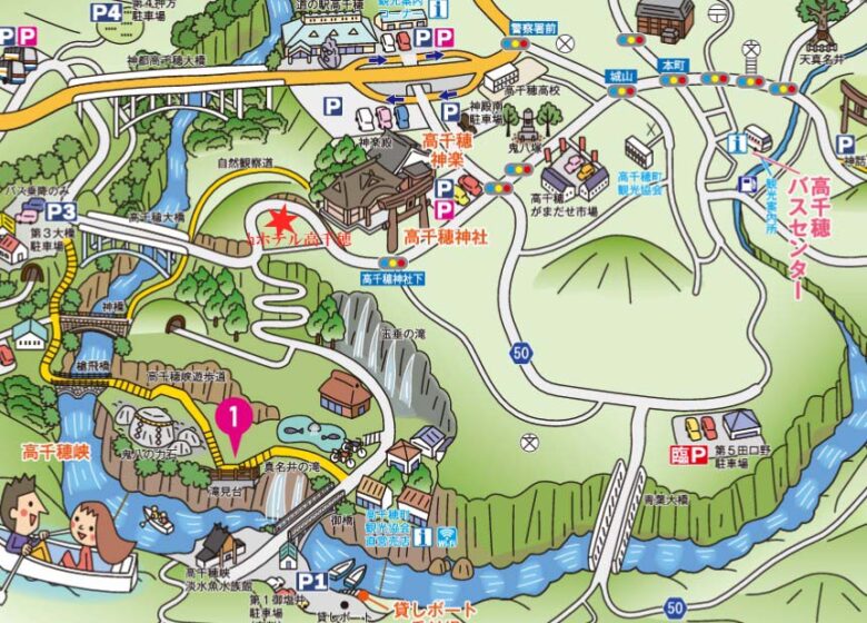高千穂観光協会パンフレットより高千穂観光イラストマップ PDFが見れます。