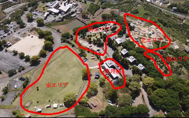 東エリア(芝生広場)、西エリア、北エリア、林エリア。